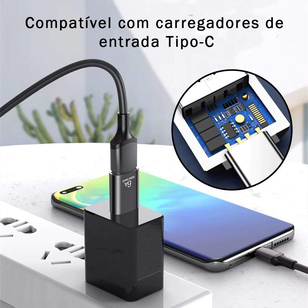 Segurança Térmica: O metal atua como um dissipador de calor avançado, evitando o superaquecimento do adaptador e protegendo a bateria do seu dispositivo durante cargas de alta potência (120W/6A).