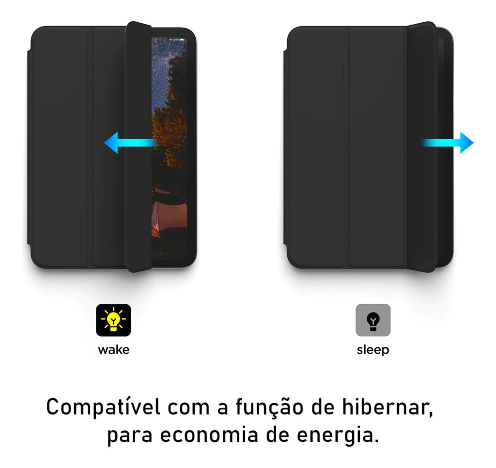 A tampa magnética garante um fechamento seguro e prático, além de ativar a função auto-sleep/ wake, que liga e desliga automaticamente a tela do seu tablet ao abrir e fechar a capa, economizando bateria. O encaixe magnético firme mantém o tablet seguro dentro da capa, evitando deslizamento e quedas acidentais.