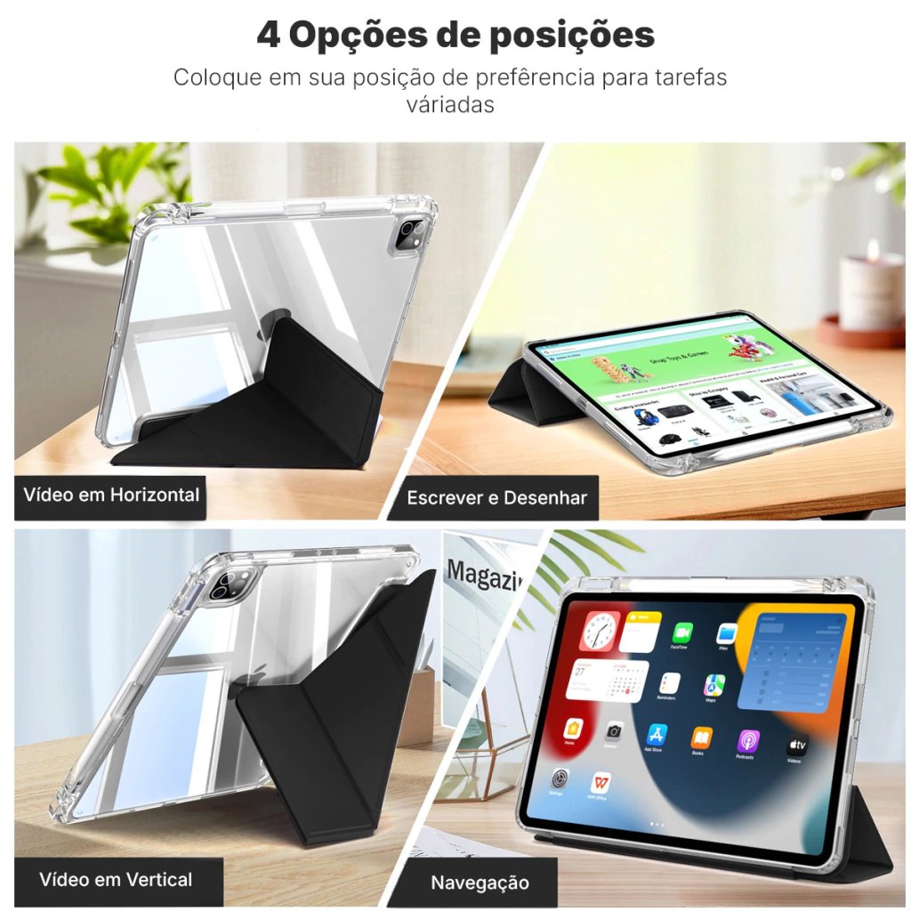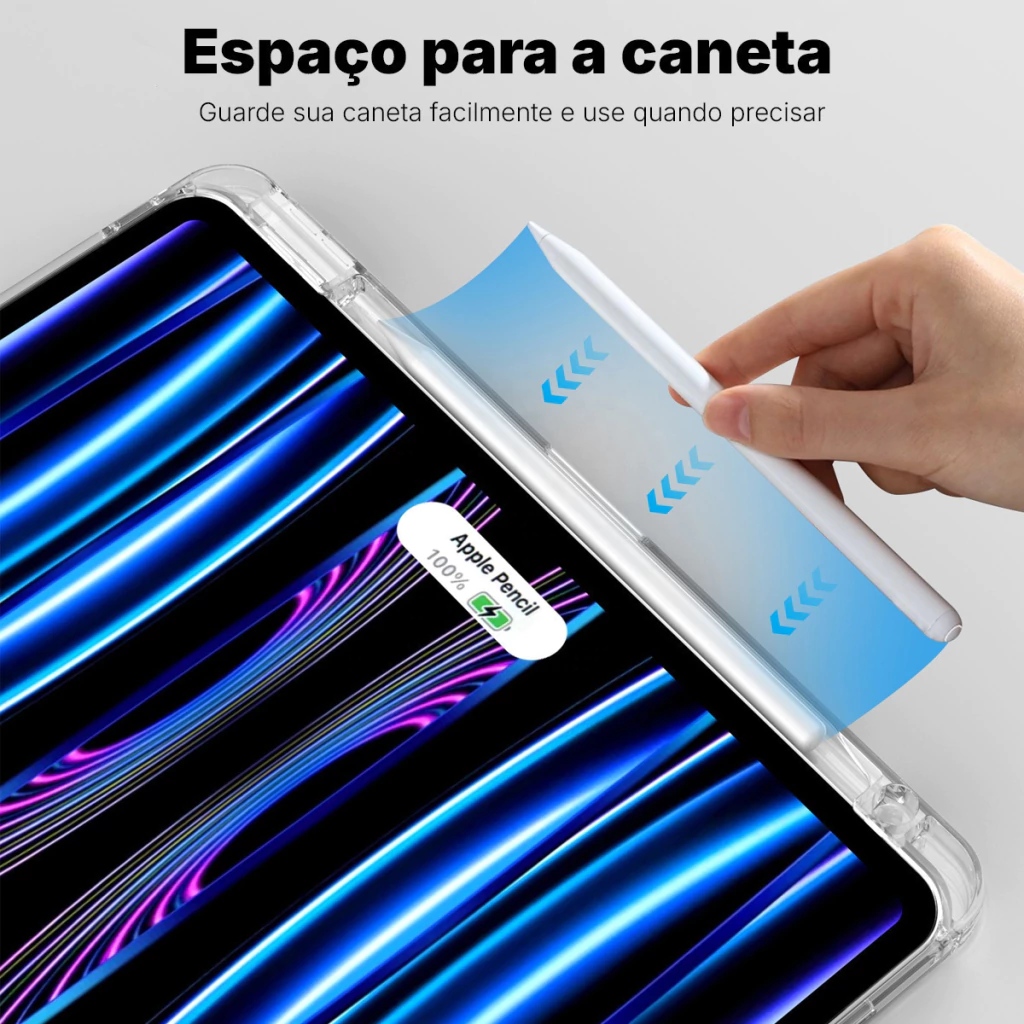 Suporte para Caneta Integrado: conta com um compartimento prático para guardar com segurança sua Apple Pencil ou caneta stylus, sempre ao alcance quando precisar.