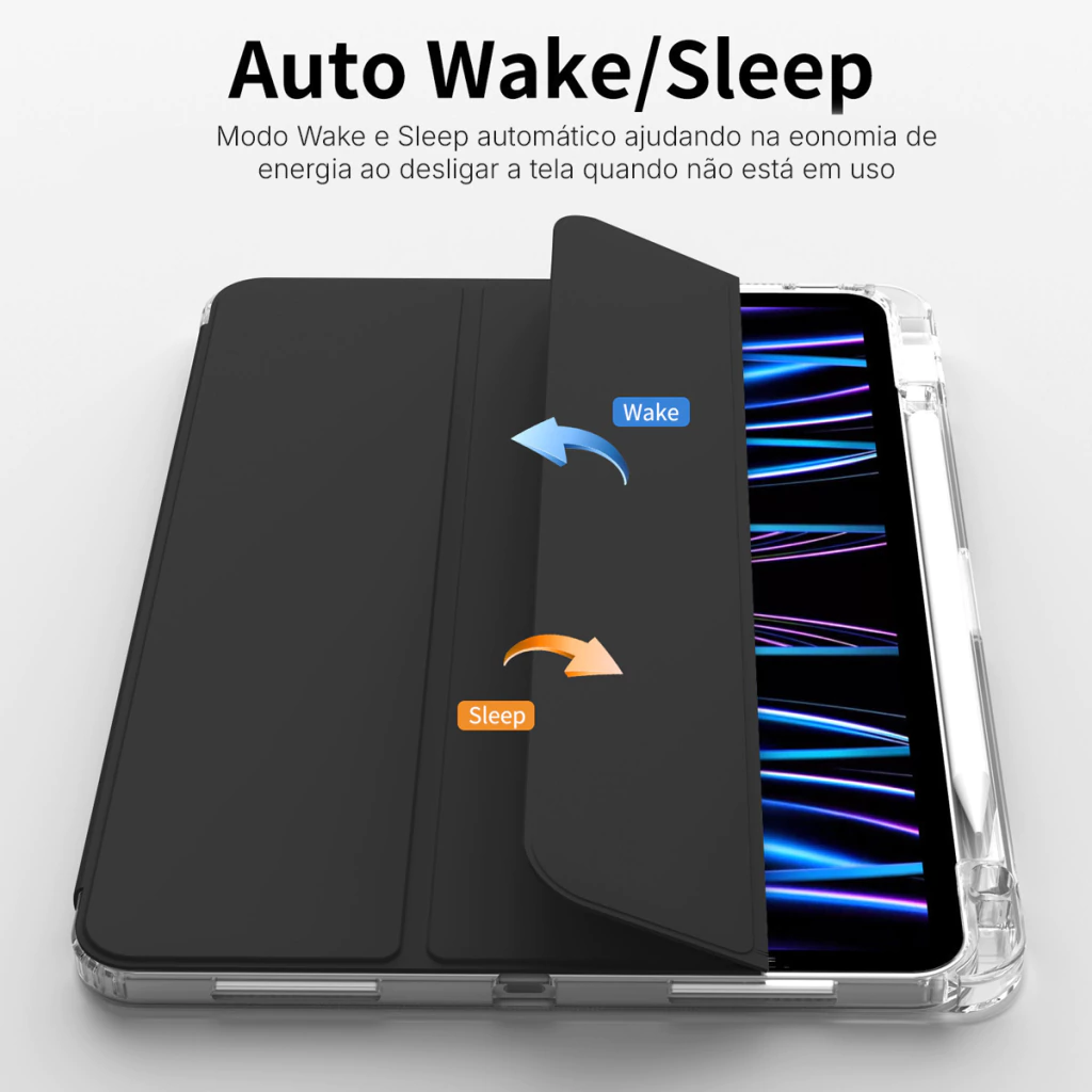 Função Auto Despertar/Repouso: ativa automaticamente o iPad ao abrir a capa e o coloca em modo de repouso ao fechar, ajudando a economizar bateria.