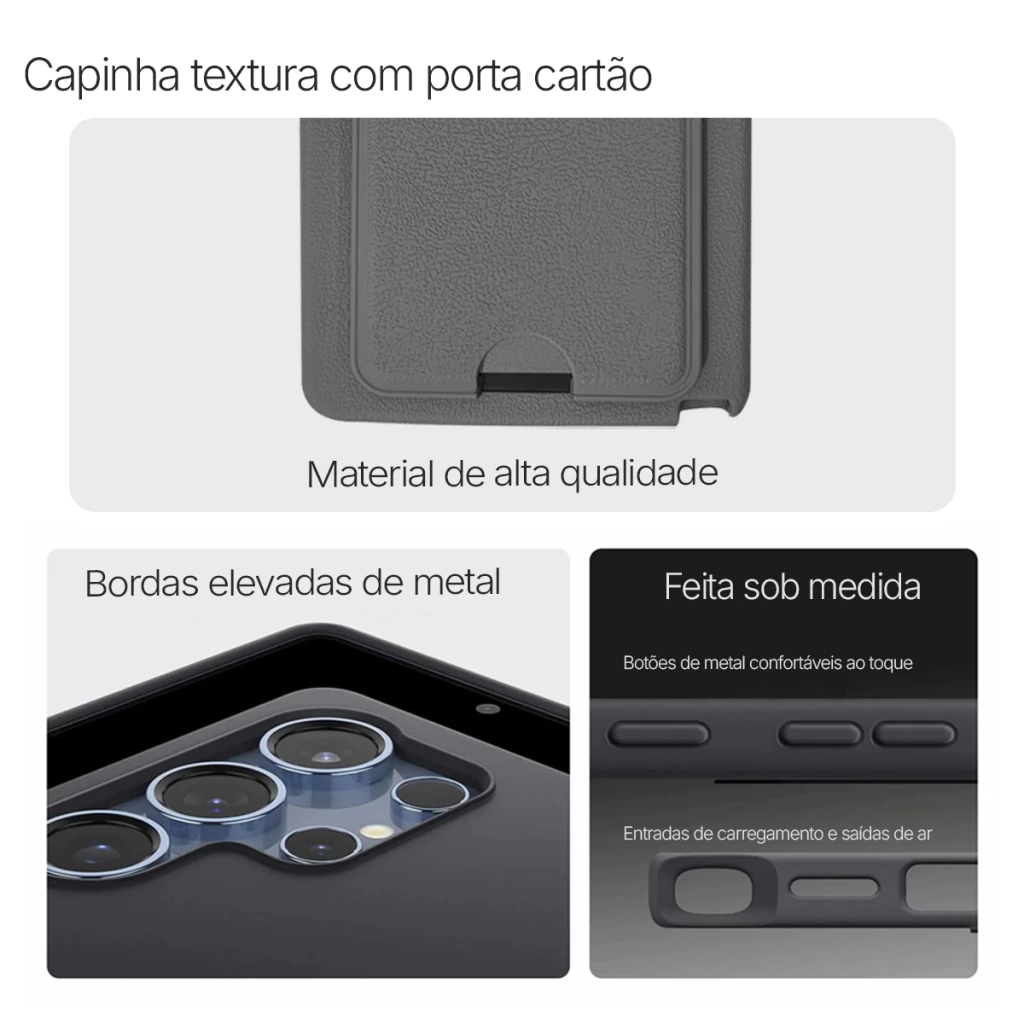 . Design Premium: Feita em Silicone Texturizado como couro, essa capinha combina elegância e toque suave, oferecendo uma aparência sofisticada e confortável além de não escorregar.