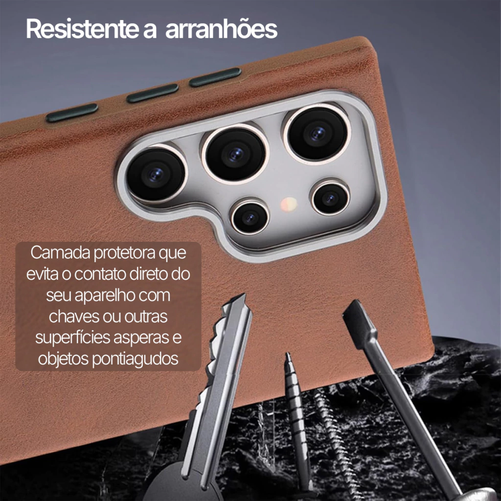 Design Premium: Feita em couro sintético vegano, essa capinha combina elegância e toque suave, oferecendo uma aparência sofisticada e confortável.