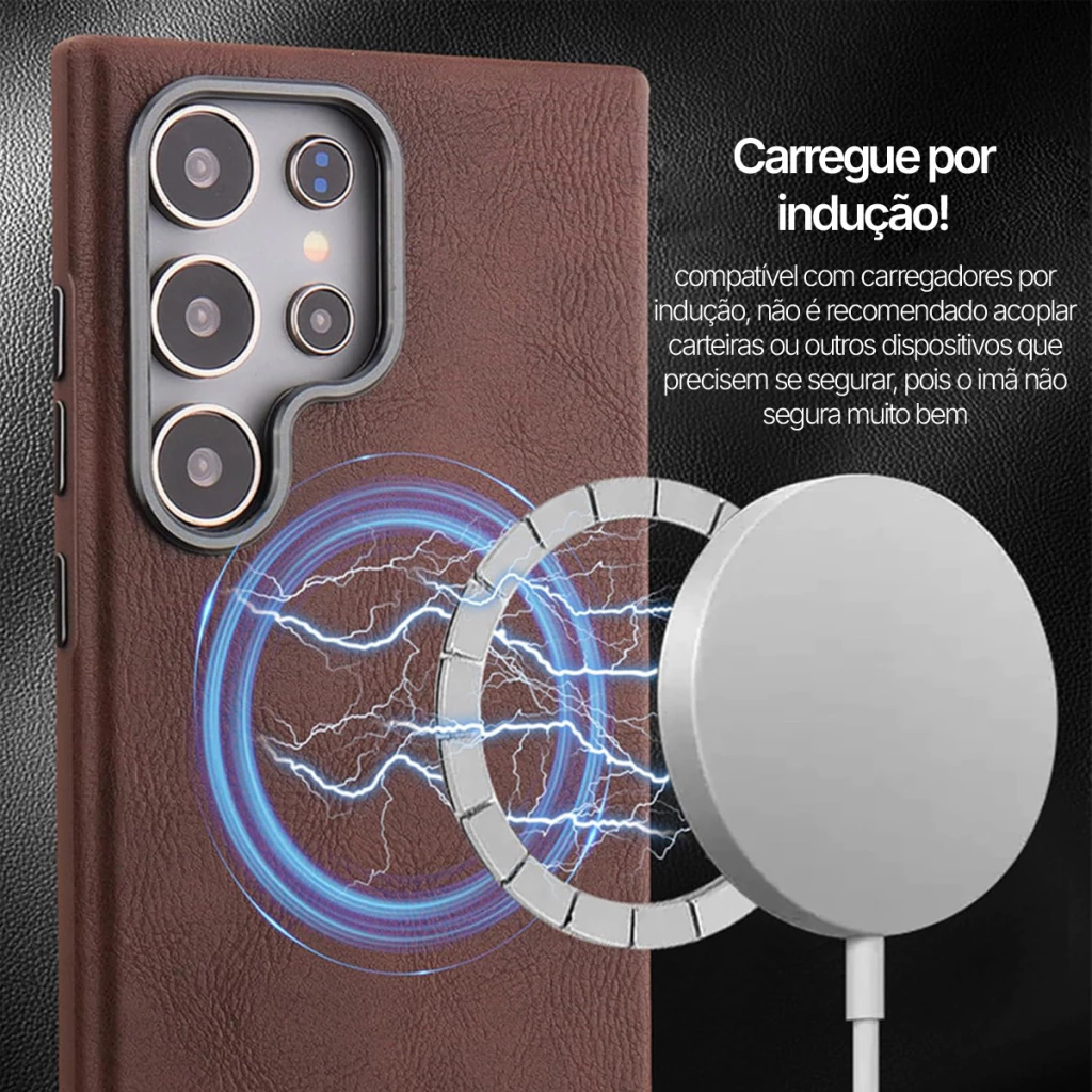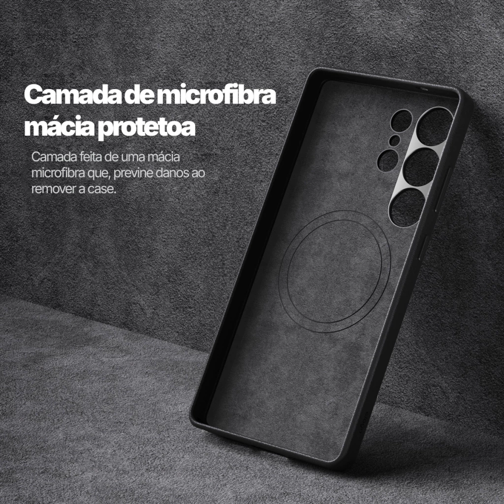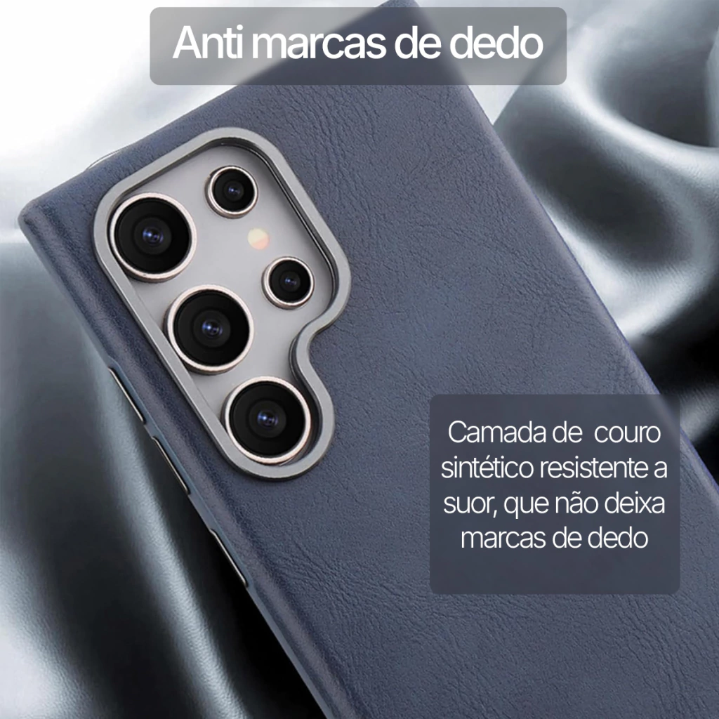 Design Premium: Feita em couro sintético vegano, essa capinha combina elegância e toque suave, oferecendo uma aparência sofisticada e confortável.