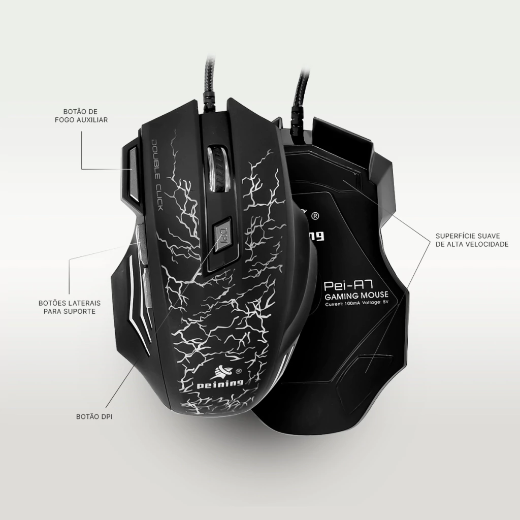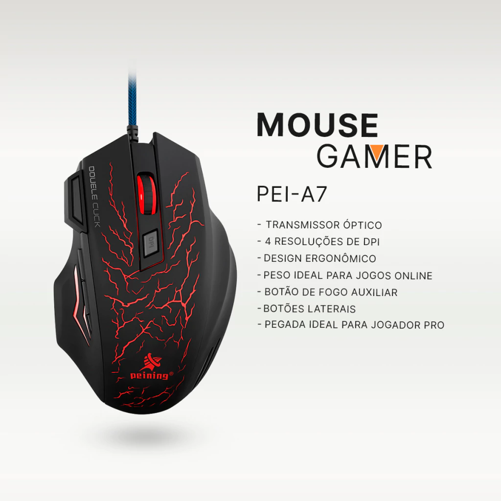 O Mouse Gamer PEI-A7 combina precisão, ergonomia e estilo para elevar seu desempenho nos games. Perfeito para jogadores que exigem controle e conforto em cada partida.