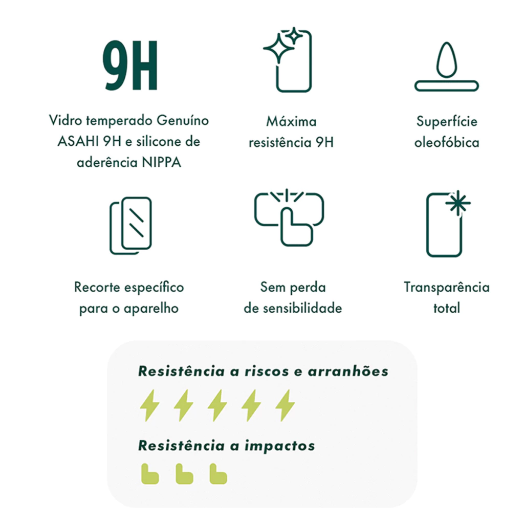 Produzida com vidro temperado Genuíno de 1ª qualidade importado do Japão, elas são extremamente resistentes contra quedas, choques, riscos ou arranhões e não interferem na sensibilidade do touchscreen.