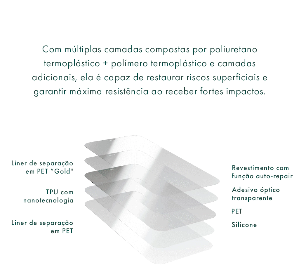 Com o uso de nanotecnologia, a NanoShield® possui camada de auto reparo, que se recupera de pequenos riscos em instantes, além de possuir a mesma proteção contra impactos do que o Vidro Temperado HPrime de 0,33mmm com o diferencial de que não se quebra ao receber fortes impactos.