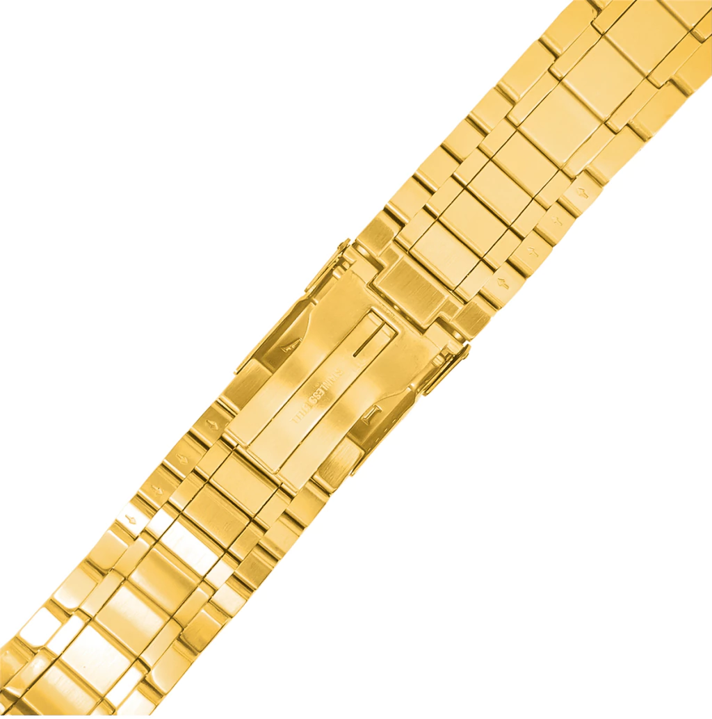 Fabricada em aço inoxidável de alta qualidade, oferece resistência à corrosão, brilho duradouro e conforto no uso diário. O acabamento dourado polido garante um visual sofisticado, ideal para quem deseja destacar o relógio em qualquer ocasião.