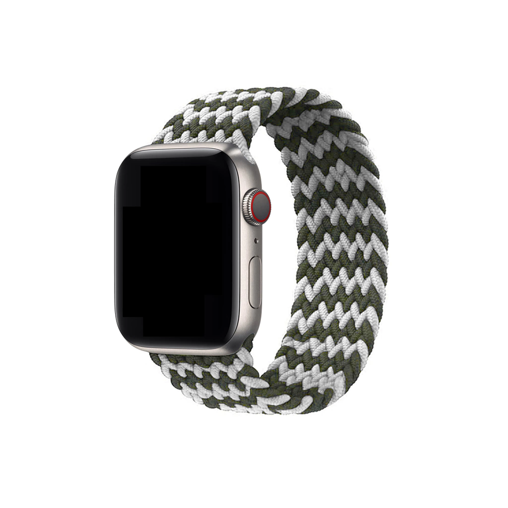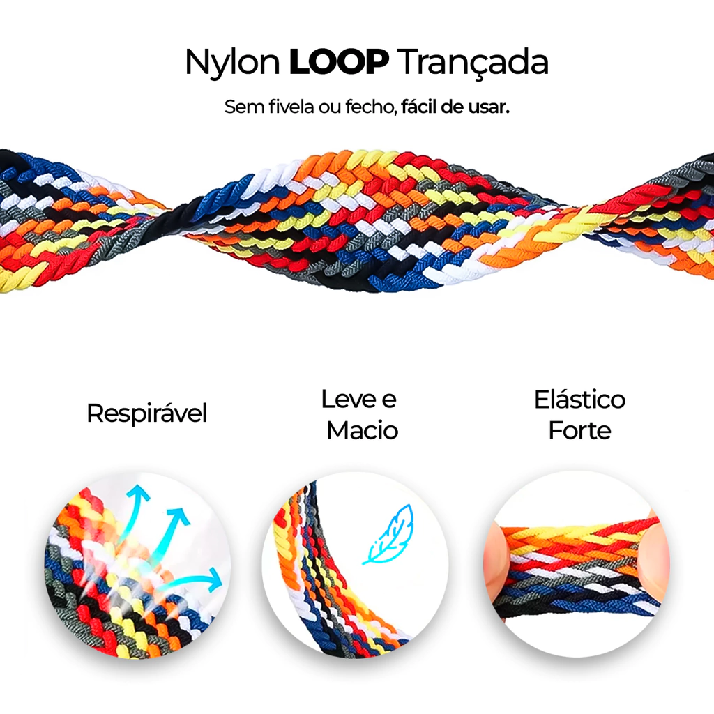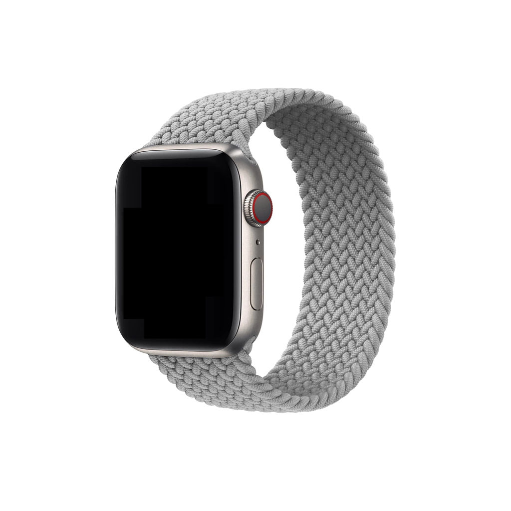 As pulseiras loop solo trançadas têm um design elástico único, muito confortável e fácil de colocar e tirar do pulso. Cada uma delas é feita com 16 mil filamentos de poliéster reciclado entrelaçados com linhas de silicone ultrafinas por máquinas modernas e precisas. Depois, são cortadas a laser para obter o tamanho exato. A estrutura texturizada é suave ao toque e resistente ao suor e à água.