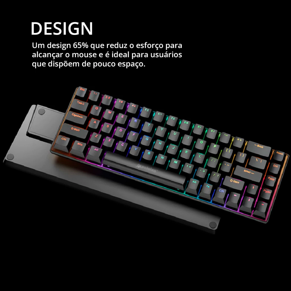 Com 68 teclas no formato 65%, o PEI-FR3025 oferece um layout otimizado, eliminando o teclado numérico, mas mantendo todas as teclas funcionais mais usadas no dia a dia e nos games.